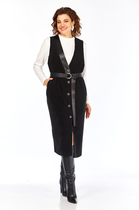 Комплект женский двухпредметный, состоит из джемпера и сарафана. Сарафан прямого силуэта из трикотажного полотна с имитацией вельвета. Горловина V -образной формы с отделкой из экокожи. Застежка центрально — бортовая на петли и пуговицы. По переду нагрудные вытачки и обработаны карманы с листочками. На спинке фигурный вырез. Сарафан на подкладке. Джемпер полуприлегающего силуэта, выполнен из трикотажного полотна. Горловина круглой формы. Рукава втачные, длинные. В комплекте съемный ремень.