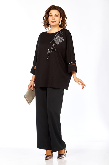 Комплект брючный, нарядный, состоит из джемпера и брюк. Джемпер женский свободного кроя. Перед разрезной, с дизайнерской вышивкой — аппликацией. Горловина круглой формы с кантом. Рукава цельнокроеные со вставками из сетки и с кантом. Брюки прямого силуэта из костюмно — плательной ткани. Пояс притачной на резинке. В брюках обработаны карманы.