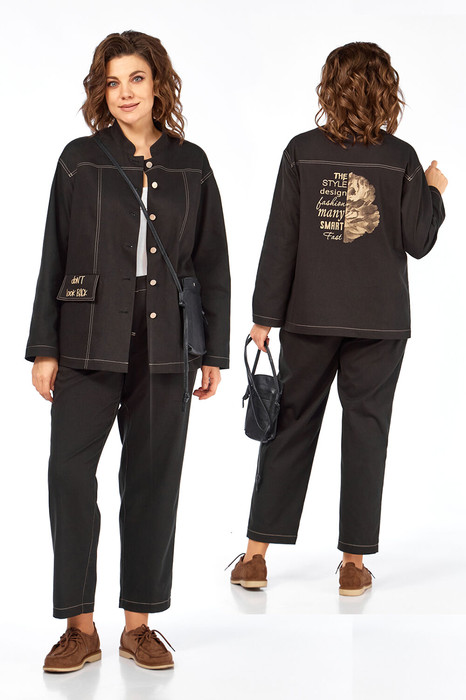 Костюм брючный двухпредметный, состоит из жакета и брюк, выполнен из ткани костюмно-плательного ассортимента. Жакет прямого силуэта. Горловина обработана воротником — стойка, застежка центрально — бортовая на петли и пробивные пуговицы. Перед с кокетками и рельефами выходящими из них. Имеются прорезные карманы с клапаном. Спинка на кокетке. Рукава рубашечного типа. Жакет дополнен печатью. Брюки свободного силуэта слегка заужены к низу. Пояс притачной, частично на эластичной тесьме, с застежкой на петлю и пробивную пуговицу. По переду обработаны карманы с листочкой и подрезным бочком. Вдоль швов костюма проходят контрастные строчки из отделочных ниток.