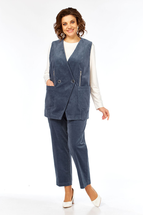 "Костюм брючный 3х — предметный, состоит из жилета, лонгслива и брюк. Жилет и брюки выполнены из хлопкового вельвета, лонгслив из трикотажной вискозы. Жилет прямого силуэта с двубортной застежкой на петлю и пуговицу. Горловина V-образной формы. По переду обработаны накладные карманы, в рельефах декоративные элементы с молниями. Спинка с фигурной кокеткой. Брюки свободного силуэта, с притачным поясом и вставками эластичной тесьмы. Застежка на петлю и пуговицу. В передних деталях брюк обработаны карманы с подрезным бочком. Лонгслив прямого силуэта, перед и спинка цельнокроеные, рукава втачные. Горловина обработана бейкой.