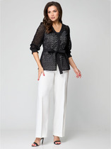 Комплект брючный 2-х предметный состоит из джемпера и брюк. Джемпер свободного силуэта, выполнен из трикотажного полотна. Горловина округлой формы обработана бейкой. Перед и спинка разрезные по центру и обработаны декоративным швом. Рукава спущенные. В боковых швах обработаны фигурные шлицы. Джемпер декорирован дизайнерской вышивкой — аппликацией. Брюки классической посадки с притачным поясом со вставками эластичной тесьмы. Застежка на петлю и пуговицу. В передних деталях брюк имеются карманы с подрезным бочком.