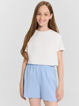 Костюм детский футболка и брюки. Футболка из кулирного полотна, набивка с рисунком "Буквы". Покрой-реглан, прямого силуэта с коротким рукавом и круглой горловиной, обработанной узким воротником. Брюки из кулирного полотна с лайкрой цвета индиго. Прямого, свободного покроя, с имитацией застежки-гульфик. Карманы "хулиган". На задних частях отрезная кокетка. Низ подгибка. Пояс с втачной резинкой.