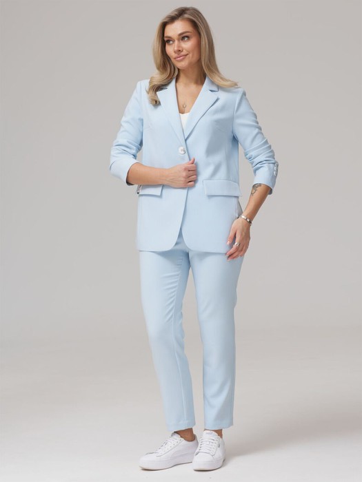 Костюм женский, состоящий из жакета и брюк. Жакет женский прямого силуэта с центральной бортовой застежкой на петли и пуговицы, частично на подкладке. По переду обработаны нагрудные вытачки, рельефы и прорезные карманы с клапаном и листочкой. Левый клапан декорирован нашивкой. Спинка со средним швом, в котором обработана шлица. Рукав длинный 2-х шовный, с имитацией шлицы, декорированной пуговицами. Воротник пиджачного типа с отрезной стойкой. Брюки женские, слегка заужены. Спереди карман с наклонным, застежка на молнию. Сзади застрочены вытачки, справа прорезной нефункциональный карман в рамку. Верх брюк обработан притачным поясом со шлевками, застегивающимся на петлю и пуговицу.