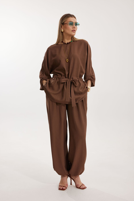 Брюки  прямого силуэта с поясом на резинке. По передним половинкам заложены складки и обработаны наклонные карманы с отрезным бочком По низу брюки собраны на резинку. Верхний срез брюк обработан отрезным поясом на частичной резинке.