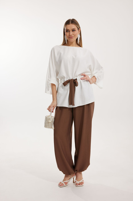 Брюки контрастного цвета прямого силуэта с поясом на резинке. По передним половинкам заложены складки и обработаны наклонные карманы с отрезным бочком По низу брюки собраны на резинку. Верхний срез брюк обработан отрезным поясом на частичной резинке.