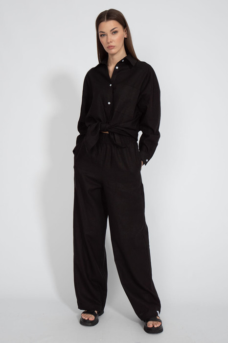 Костюм состоящий из льняной рубашки свободного кроя со спущенными рукавами и накладным карманом и брюк прямого свободного кроя. С карманами в боковых швах. Отлично сочетаются с джемпером модели 4075, шортами 4074, рубашкой 4081, джоггерами 4082. Ткань лен. Ткань лен с вискозой.