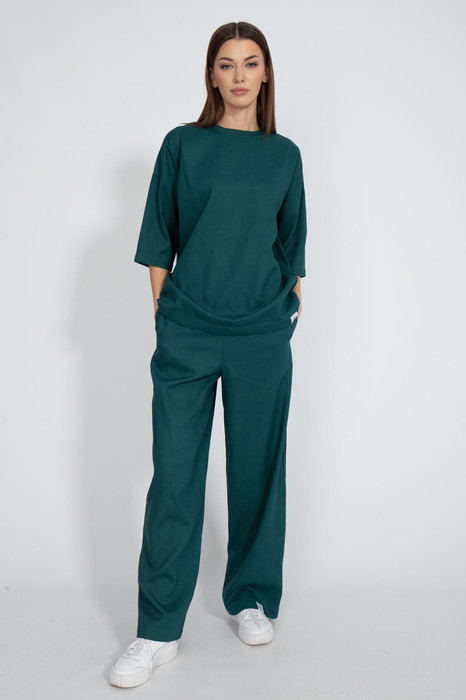 Костюм состоящий из брюк прямого свободного кроя с карманами в боковых швах и джемпера свободного кроя. С приспущенным рукавом и кулиской по низу изделия с возможностью регулировки ширины низа. Ткань лен. Отлично сочетается с шортами модели 4074, рубашкой 4073, рубашкой 4081, джоггерами 4082.