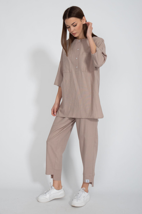Костюм состоящий из рубашки льняной свободного кроя со спущенными рукавами, накладными карманами, застежкой поло, удлиненной по спинке, с разрезами в боковых швах и джоггеров льняных с оборкой по верху пояса, карманы в боковых швах. Низ джоггеров обработан манжетой, удлиненными по спинке. Отлично сочетаются с джемпером модели 4075, рубашкой модели 4073, 4070, 4081. Ткань лен.