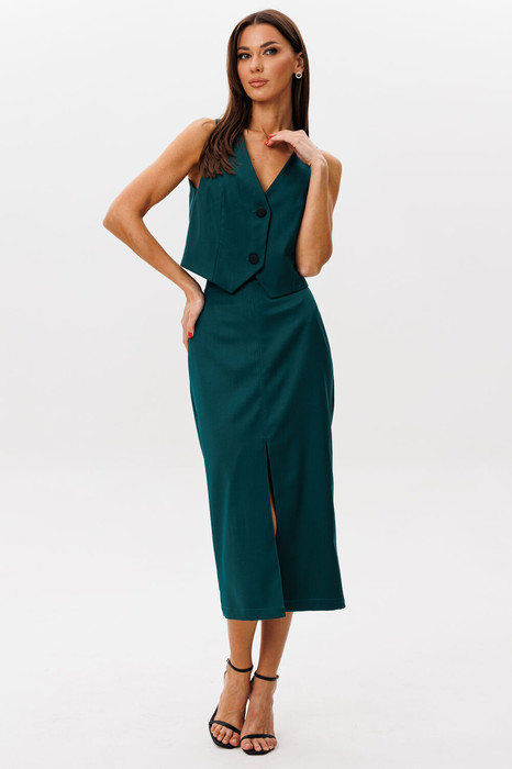 Этот элегантный костюм состоит из классической юбки-карандаша с разрезом спереди и жилета на подкладке, выполненного из высококачественной костюмной ткани. Завышенная линия талии и зауженный силуэт юбки подчеркивают достоинства фигуры, а разрез добавляет нотку современности в образ. Жилет с V-образным вырезом и застежкой на две пуговицы идеально дополняет юбку, создавая гармоничный и стильный ансамбль. Такой костюм прекрасно подойдет для офисных будней, деловых встреч и торжественных мероприятий, а благодаря разнообразию сочетаний с блузами и аксессуарами, он никогда не потеряет своей актуальности.