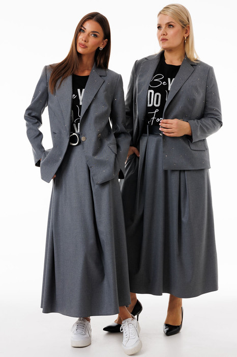 Идеальное сочетание элегантности и современного шика! Классический костюм, состоящий из двубортного жакета и удлинённой юбки, станет жемчужиной вашего гардероба. Жакет выполнен из костюмной ткани премиум-качества с деликатным декором из стразов, которые добавляют ноту благородного блеска. Модель с английским воротником подчеркнёт строгость линий, а прорезные карманы в рамку с клапанами придают образу лаконичность и функциональность. Усиленная конструкция и двубортная застёжка гарантируют идеальную посадку по фигуре.