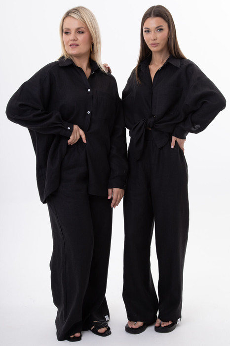 Блуза: Изысканный крой с аккуратным воротником и натуральной текстурой льна подчеркивает женственность. Легкий силуэт идеально сочетается с брюками, создавая целостный лук для офиса, прогулок или отдыха.