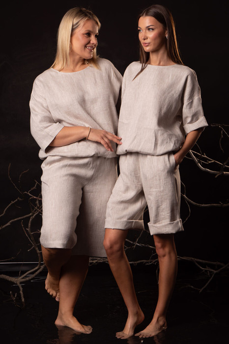 Эксклюзивный летний костюм из белорусского льна с вискозой — идеальное сочетание элегантности, комфорта и функциональности. Набор включает джемпер свободного прямого силуэта со съемным декоративным бантом и шорты на эластичной резинке с боковыми карманами. Натуральные материалы обеспечивают дышащую легкость, гипоаллергенность и устойчивость к деформации, сохраняя безупречный вид даже в жаркие дни.