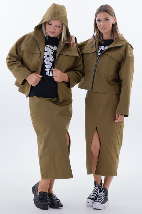 Kivvi Wear представляет идеальный дуэт, где уличный шик встречается с безупречной элегантностью. Джинсовый костюм — это гармоничный ансамбль из укороченной ветровки и юбки-карандаш, созданный для тех, кто ценит смелые контрасты и многослойность.