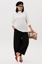 Хлопковая блуза полуприлегающего силуэта со спущенными рукавами служит идеальной основой. Её изюминка — деликатные отделочные элементы из ткани в мелкую полоску: они украшают кокетку, накладной карман на правой стороне и отделочную полосу по левой стороне. Этот прием создает визуальную глубину и тонко связывает блузу с брюками.