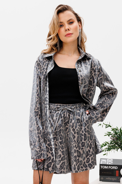 Трендовый комплект в леопардовый принт. Комплект состоит из блузки прямого кроя с длинным рукавом и свободных шорт на резинке. Блузка с застежкой по переду на золотые пуговицы. Шорты с карманом по переду, поям на резинке и с шнурочком, для регулировки по талии. Этот комплект можно надеть с босоножками на каблуках и пойти на вечеринку, а можно носить в повседневной жизни дома, на даче или маме в декрете на прогулке. Длина блузки 75 см. Длина шорт 45 см.