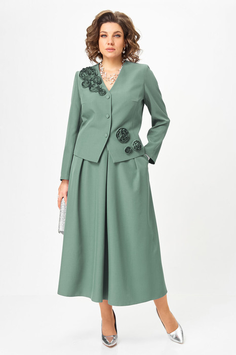 Элегантный юбочный костюм, стильный и универсальный наряд для торжественных и праздничных мероприятий.  Обеспечит вашему образу максимум внимания и комплементов , благодаря безупречному подбору цвета и художественному оформлению цветочной аппликации ! Жакет с подкладкой по полочке , полуприлегающего силуэта с v образным вырезом , рукав втачной двух шовный . Юбка без подкладки,  на поясе  с боковыми резинками, расклешенного силуэта со складками по переду и боковыми карманами.