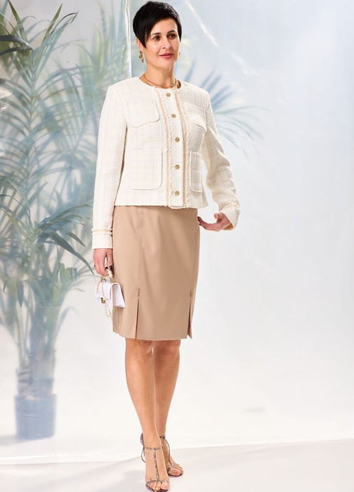 Состав: Жакет- ПЭ-68%; Хлопок-30%; Эластан-2%; Юбка- Вискоза-32%; ПЭ-65%; Спандекс-2%;