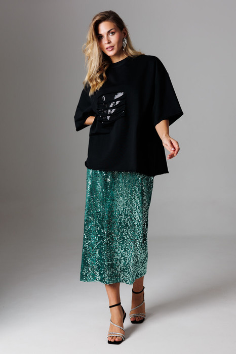 Актуальный комплект: блузон-майка стиля oversize с фронтальной вставкой из пайеточного полотна и юбки-карандаш из ворсового трикотажного полотна с пайетками.