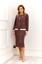 Юбка на подкладке прямого силуэта, чуть зауженная к низу. В среднем шве размещена потайная молния и открытый разрез. На линии талии размещены классические вытачки. Пояс внутренний, обтачной. Длина юбки по среднему шву 72 см. Высота разреза 21 см.