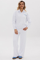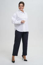Брюки комплекта созданы в свободном стиле. В пояс брюк по спинке вставлена эластичная тесьма, шириной 3 см. Спереди пояс фиксируется горизонтально на петли/пуговицы и вертикалную закрытую клапан-молнию (гульфик).