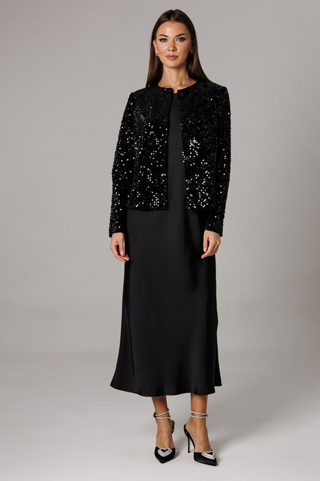 Жакет полуоблегающего силуэта с притачными рельефными бочками на спинке полочке из эффектной ткани с пайетками. Застежка фронтально вертикальная на скрытую кнопочную систему. Рукав втачной двухшовный. Длина жакета по спинке 54- 55 см, длина рукава 61-62 см. Горловина округлой формы.