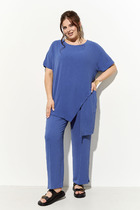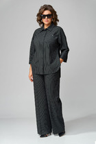 Брюки комплекта созданы в свободном стиле. Силуэт брюк имеет фигурное незначительное расширение к низу изделия. В пояс брюк по спинке вставлена эластичная тесьма, шириной 3 см. Спереди пояс фиксируется горизонтально на петли/пуговицы и вертикалную закрытую клапан-молнию (гульфик).