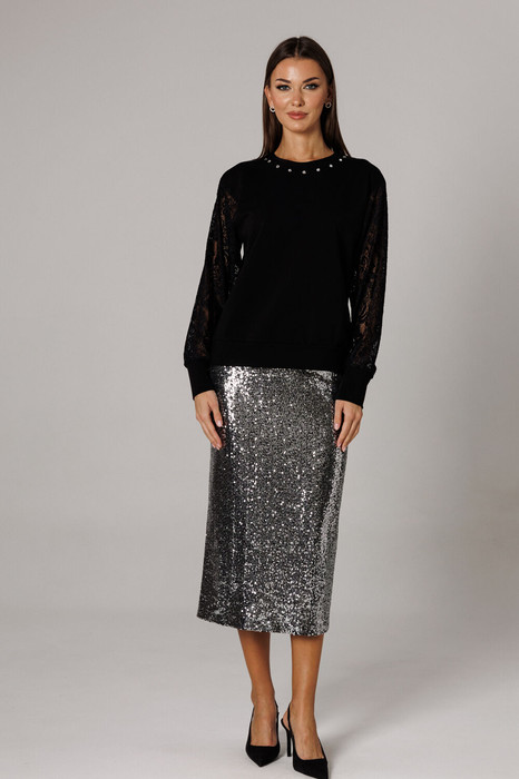 Юбка из трикотажного полотна с пайетками, на укороченной подкладке прямого силуэта, чуть зауженная к низу. В среднем шве размещена потайная молния и открытый разрез. На линии талии размещены классические вытачки. Пояс внутренний, обтачной. Длина юбки по среднему шву 80-81 см. Высота разреза 32 см.