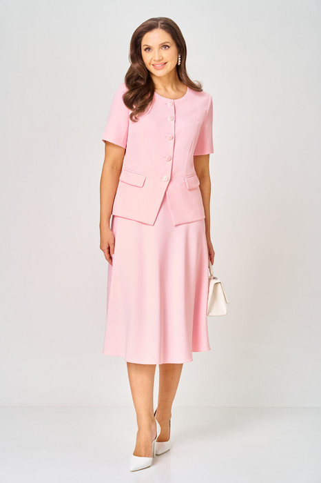 Комплект состоит из жакета и юбки и  изготовлен из костюмной ткани , тактильно-приятной на ощупь , износостойкой, устойчивой к появлению заломов, простой в уходе. Жакет полуприлегающего силуэта на подкладке. Перед с двумя рельефами, выходящими от плеча, с прорезными карманами в рамку с клапаном, с центральной застёжкой на пуговицы. Вырез горловины  круглый. Низ переда фигурный. Рукав короткий, двухшовный на подкладке. Спинка со средним швом и двумя талиевыми вытачками. Юбка колоколообразной формы, на подкладке, кроеная по косой, с притачным поясом и застёжкой на молнию в боковом шве.