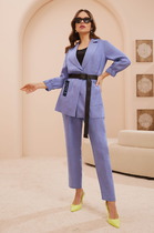 Комплект женский состоящий из жакета, юбки и трикотажного топа. Жакет на подкладке, приталенного силуэта, втачного покроя. По переду фигурные рельефы в виде встречных защипов. Спинка со средним швом и вертикальными рельефами из проймы. Вырез горловины фигурный. Застежка центральная бортовая на 3 обтяжные пуговицы и петли. Рукав двухшовный длиной ниже линии локтя с манжетой по низу, шов манжеты рукава оформлен встречными защипами.