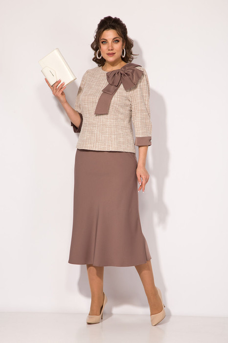 Эффектный нарядный костюм, для особого случая в стиле CHANEL. Блузон полуприталенного силуэта, выполнен из фактурного трикотажа. Рукав вточноу, по низу на манжете из отделочной ткани на декоративную пуговку. Полочка с продольными рельефами, декорирована эффектным атласным бантом. Спинка с центральным швом и застежкой на тесьму-молнию. Юбка длиной миди, выкроена по косой, слегка расклешена к низу. Пояс цельнокроеный с круговой резинкой. Юбка на стрейчевой подкладке.