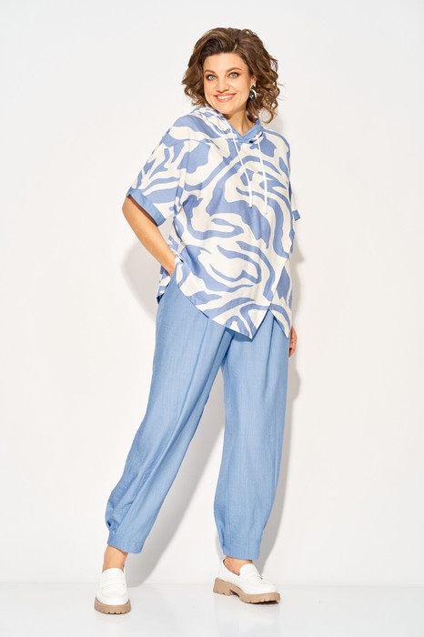 Стильный летний костюм, состоящий из удлиненной туники свободного покроя и брюк. Оригинальная туника из вискозы   добавлением льна. Модель с цельнокроеным укороченным рукавом и ассиметричным подрезом по полочке. Модель с легким капюшоном и кулисой на шнуровке. Низ изделия разноуровневый. Спинка цельная. В комплекте свободные брючки, завышенной посадки. Брюки на притачном поясе с круговой резинкой. Имеются боковые карманы. Низ с заложенными складками, что придает изделию более спортивный образ.