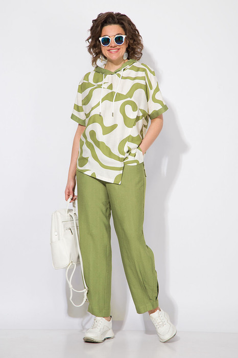 Стильный летний костюм, состоящий из удлиненной туники свободного покроя и брюк. Оригинальная туника из вискозы добавлением льна. Модель с цельнокроеным укороченным рукавом и ассиметричным подрезом по полочке. Модель с легким капюшоном и кулисой на шнуровке. Низ изделия разноуровневый. Спинка цельная. В комплекте свободные брючки, завышенной посадки. Брюки на притачном поясе с круговой резинкой. Имеются боковые карманы. Низ с заложенными складками, что придает изделию более спортивный образ.