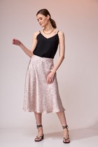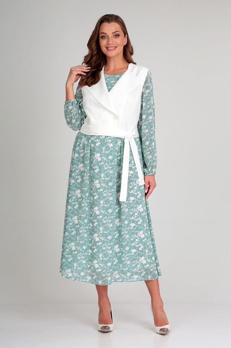 Шифоновое платье свободного силуэта на трикотажной подкладке. Горловина овальной формы. Платье отрезное чуть выше линии талии, на сборке. Рукав втачной. Низ рукава собран на эластичную тесьму. Жилет с нагрудными вытачками, отложными лацканами и двубортной застёжкой на петли и пуговицы. Спинка жилета с отлетной деталью. По низу жилета располагаются шлёвки с продетым в них съёмным поясом. Жилет на подкладке.