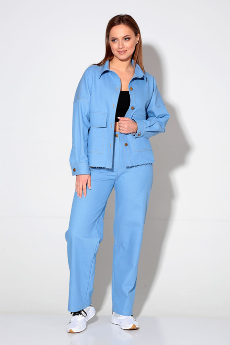 Жакет прямого силуэта со спущенной линией плеча. Воротник рубашечного типа. По переду накладные карманы с клапаном. Центральная застёжка на петли и пуговицы. По спинке настроченная кулиса со шнуром из основной ткани. Низ рукава на притачной манжете с застёжкой на петлю и пуговицу. Брюки на притачном поясе, от середины передних половинок и по спинке на резинке. Застежка брюк спереди по типу «гульфик». По бокам карманы с наклонным входом. Сзади накладные карманы.
