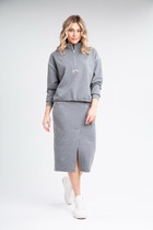 Жакет полуприталенного силуэта с центральной бортовой застежкой на 2 петли и пуговицы. Воротник пиджачного типа с отложными лацканами. По переду накладные карманы с клапанами. Рукава втачные двух-шовные. Жакет без подкладки. Брюки на притачном поясе, от середины передних половинок и по спинке на резинке, заужены к низу. Застежка брюк спереди по типу «гульфик». По бокам карманы с наклонным входом. Сзади накладные карманы.