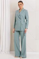 Комплект изготовлен из двух видов тканей. Жакет слегка приталенного силуэта с центральной бортовой застежкой на 3 петли и пуговицы. Воротник пиджачного типа с отложными лацканами. По переду обработаны прорезные карманы с листочкой. Рукава втачные двухшовные. Жакет на подкладке. Брюки к низу заужены, верхний срез брюк на притачном поясе, от середины передних половинок и по спинке вставлена резинка. По переду брюк имитация гульфика, по бокам карманы с наклонным входом.