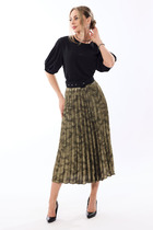 Юбка на притачном поясе с резинкой. Переднее полотнище с наклонными карманами к боковым швам и складками от пояса. Заднее полотнище с потайной молнией в среднем шве и складками от пояса. Юбка на подкладке.