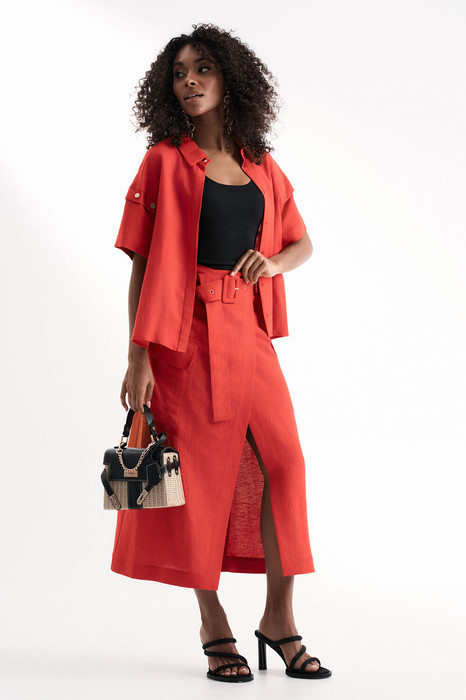 Юбка на притачном поясе и со съёмным поясом из основной ткани по талии. Изделие с застёжкой на кнопки и потайные пуговицы по переду в верхней части. Переднее полотнище с накладными карманами с клапанами. Заднее полотнище с кокеткой и средним швом.
