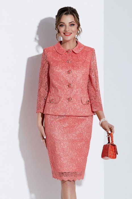 Нарядный дизайнерский костюм выполнен наложением тонкого итальянского ажура « Valentino» на гладкий однотон. Жакет полуприлегающего силуэта со стояче отложным воротником и центральной застежкой на петли и пуговицы. Перед с вертикальными рельефами из проймы и накладными клапанами с пришитыми поверх декоративными пуговицами. Спинка со средним швом и вертикальными рельефами от плеча. Рукава втачные, кружево на просвет без наложения. Юбка с отрезным поясом и вытачками , застежка на потайную молнию в среднем шве спинки, по низу разрез. Яркий акцент в виде дизайнерских пуговиц заверщает весь образ. Жакет и юбка на х/б подкладке.