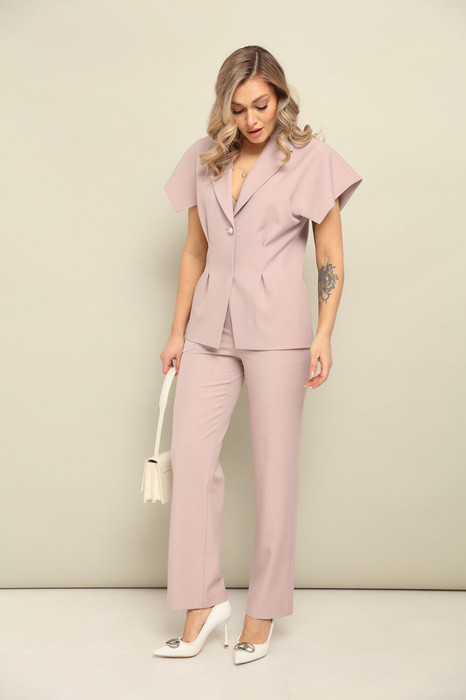 Приталеный жакет с застроченными защипами, короткими цельнокроеными рукавами-плечами и застёжкой на петлю и пуговицу. Брюки среднего объема, слегка зауженного силуэта от бедер. На передних половинках с обеих сторон расположены под наклоном функциональные карманы. На задних половинках расположены вытачки. Пояс отрезной. На поясе расположены шлевки и отделочные паты. Застежка брюк – гульфик на молнии, на поясе крючок.