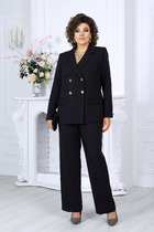 Комплект 2ка, состоящий из рубашки и брюк. Рубашка женская большого объема, прямого силуэта. На детали спинки расположена двойная кокетка, переходящая на деталь полочки. Под кокеткой на спинке встречная складка. Воротник рубашечный отложной на стойке. Застежка планка центральная на прорезные петли и пуговицы. Линия плеча спущенная, рукав рубашечный, длинный. В нижней части рукава заложены складки, заканчивается манжетой с двумя прорезными петлями и пуговицами. Низ блузки разноуровневый: спереди короче, сзади длиннее. Брюки капри, зауженные и укороченные к низу, выполнены из джинсовой ткани. По переду и сзади расположены карманы. Застежка на пуговицу и молнию.
