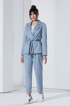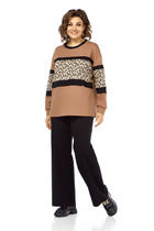 Комплект 2-ка, состоящий из жакета и брюк. Укороченный однобортный жакет приталенного силуэта с отложным воротником и лацканом. Жакет с отрезной линией талии и слегка расширенной баской. Застёжка на петли и пуговицы. По переду имитация карманов с клапанами. Рукава с имитацией шлицы с петлями и пуговицами. Брюки широкого объема, прямого силуэта. В боковых швах расположены карманы. Застежка-гульфик. Пояс отрезной, притачной. В задней части пояса вставлена эластичная тесьма (резинка). Пояс застегивается на петлю и крючок.