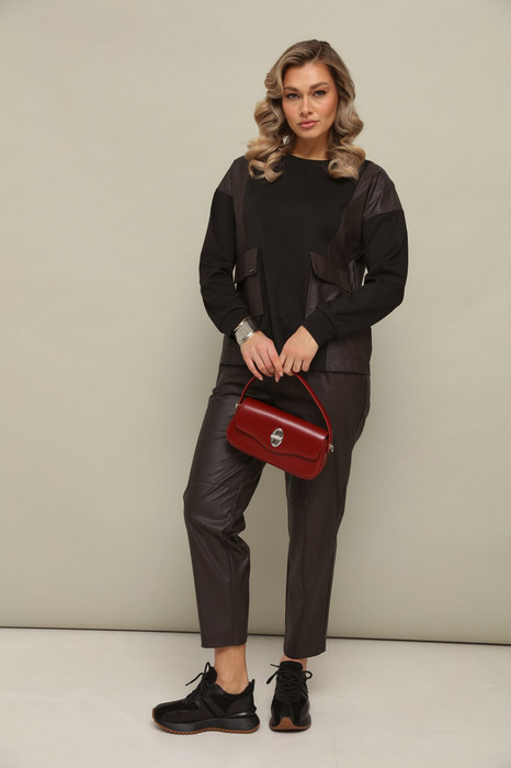 Комлект 2-ка состоит из джемпера и брюк. Трикотажный джемпер свободного кроя с длинными рукавами и круглой горловиной. Передние накладные карманы и боковые вставки выполнены из экокожи. Зауженные брюки из экокожи. Пояс на эластичной тесьме и втянутым шнурком. Вход в карман фигурный, наклонный к боковому шву.
