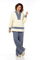 Комплект 2ка, состоящий из жилета и брюк. Жилет с отложным воротником и поясом. Перед жилета на запах с застёжкой на кнопки, на плечах декоративные паты. По бокам жилета выполнена имитация клапанов карманов. Брюки прямого силуэта на эластичной резинке по талии. По переду расположены карманы с наклонным входом.
