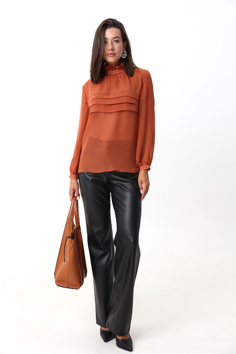 Комплект 2ка, состоящий из блузки и брюк. Элегантная блуза из легкой полупрозрачной ткани свободного силуэта. По переду блузки добавлен оригинальный элемент в виде складок, который служит декором, а также скрывает полупрозрачность блузы.