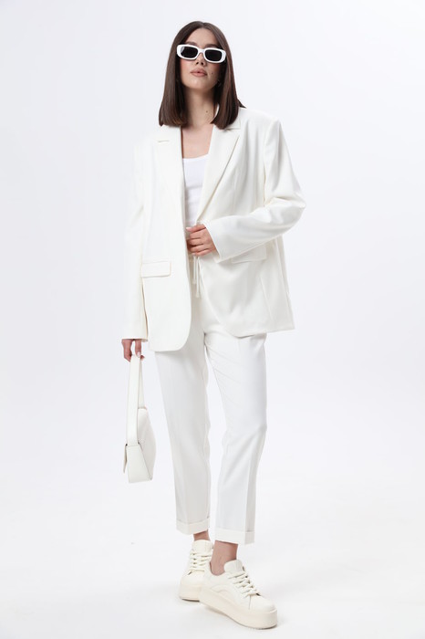 Костюм 2ка, состоящий из жакета и брюк.  Жакет однобортный объёмного силуэта с расширенным плечевым поясом. Застёжка на одну пуговицу. Из бокового шва выходит декоративная пата. По полочки располжены три прорезных кармана с клапанами, два из которых функциональные.