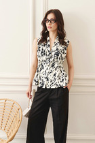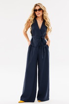 Костюм брючный состоит из блузы и брюк. Блуза из натуральной вискозы на хлопковой подкладке. Блуза без рукавов, воротник пиджачного типа, застёжка на петли и пуговицы. По всей линии талии резинка, низ блузы на сборке и обработан подкладкой. Брюки прямого силуэта, заутюженные на кант. По линии талии притачной пояс, застёжка на молнию и петлю-пуговицу. В боковых швах прорезные карманы.