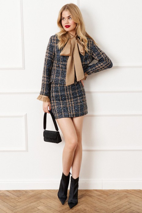 Костюм юбочный, выполнен из ткани рогожка, дизайн клетка. Жакет полуприлегающего силуэта на подкладке. Рукав вточной длинный с пристегивающейся манжетой. По переду округлый вырез горловины. Застежка центральная на петли и пуговицы. По горловине отлетной пристегивающийся воротник-бант, выполненный из отделочной вискозной ткани. По бокам карман-листочка с пуговицей. Юбка прямого силуэта на подкладке, длиной мини. По талии на обтачке, по боковому шву застёжка на потайную молнию.