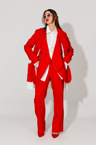 Комплект состоит из жилета и брюк. Жилет полуприлегающего силуэта на подкладке. Воротник пиджачного типа, застежка на петли и пуговицы, по линии груди клапаны, по линии бедер прорезные карманы с клапаном, по спинке средний шов и рельефы. Брюки классического кроя на притачном поясе, застежка на молнию, петлю и пуговицу. Задняя и передняя половинки брюк заутюжены на кант, в боковых швах прорезные карманы.