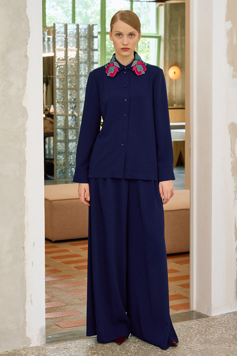 Комплект брючный выполнен из струящейся ткани. Рубашка прямого силуэта, свободного кроя. Рукав втачной длинный, по низу рукава притачная манжета на застежку. Воротник с эффектом аппликативной вышивки. Застежка центральная. Брюки на притачном поясе, застежка на молнию. В боковых швах прорезные карманы.